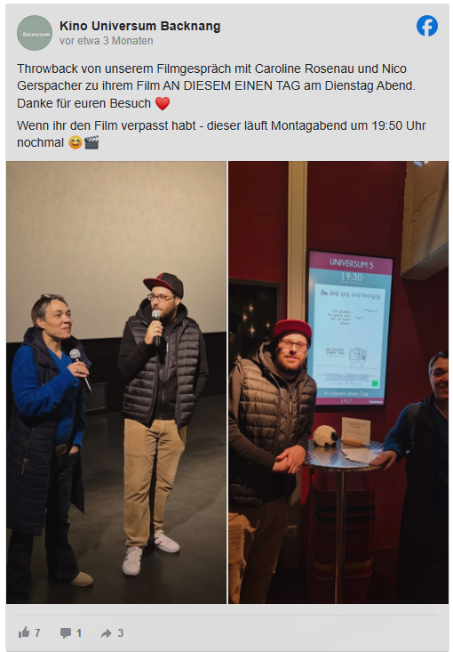 Im Rahmen der neuen Insta Videopodcast Reihe, hatte ich ein Interview mit Ulla Matzen von der Filmcommission Region Neckar Alb. Die Themen reichten von der aktuellen Situation der Medienschaffenden, über Frauen hinter der Kamera bis hin zur Produktion unseres Dokumentafilms AN DIESEM EINEN TAG.