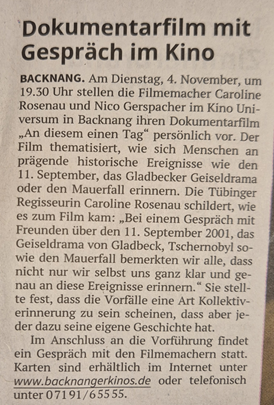 EIN ARTIKEL ZU UNSEREM DOKUMENTARFILM AN DIESEM EINEN TAG ERSCHIEN AM GRÜNDONNERTAG IM SCHWÄBISCHEN TAGBLATT